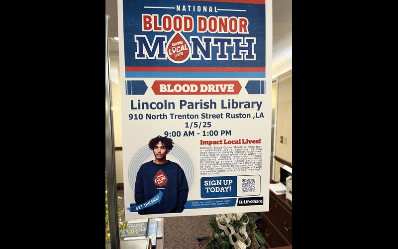 Join us January 5th, from 9:00 AM to 1:00 PM for the “Life Share Blood Drive”, held at the Lincoln Parish Library. Blood drive appointments can be scheduled ahead of time by using this link: