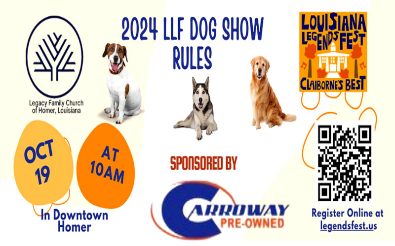 It’s the first Louisiana Legends Festival Dog Show held October 19th in Downtown Homer,La beginning at 10a.m.