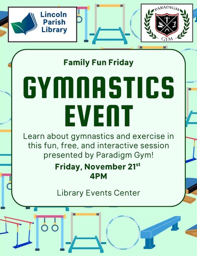 We will have a special guest for Family Fun Friday at the Lincoln Parish Events Center on November 21. Join us at 4 p.m. for a fun, free, interactive program presented by Paradigm Gym.